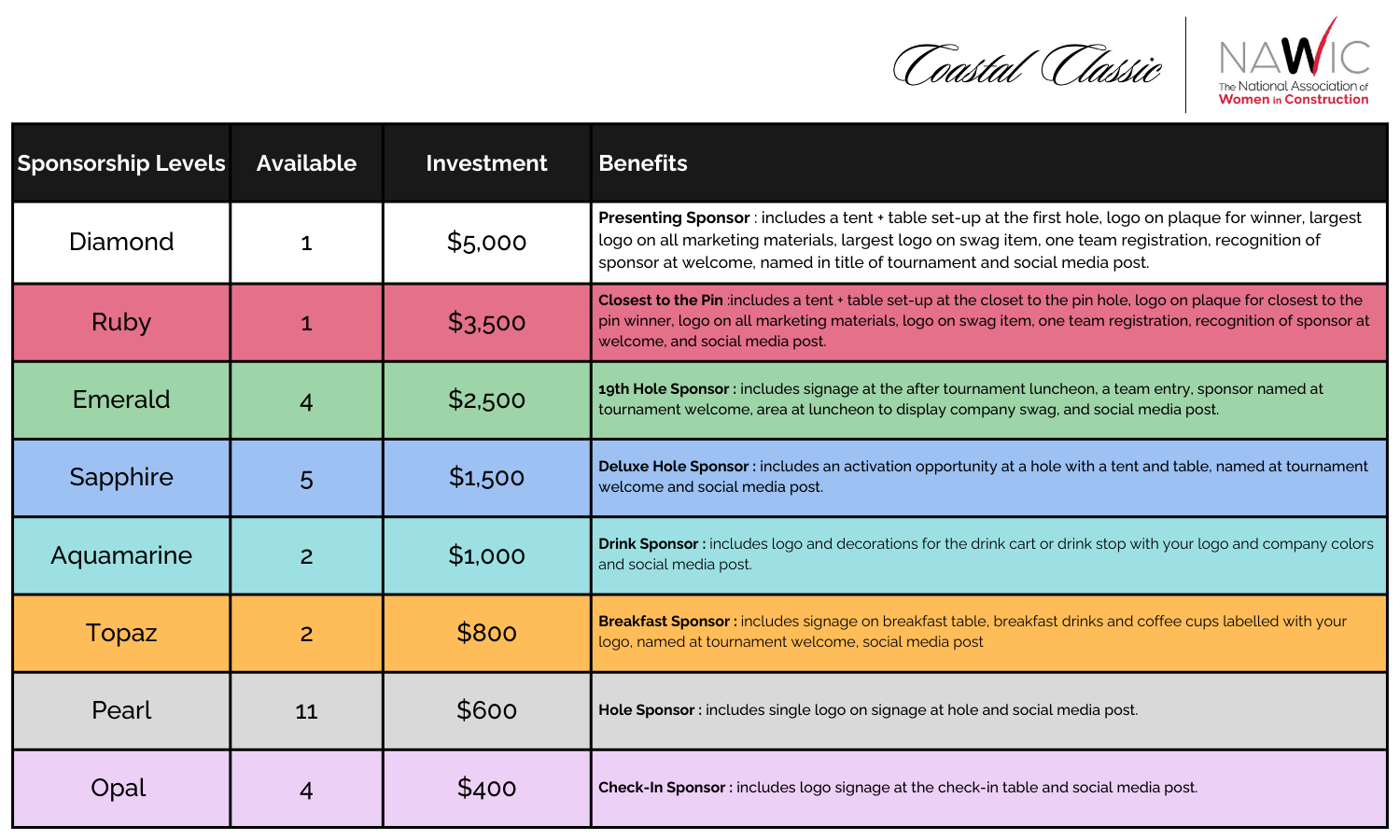 Join NAWIC of Coastal Georgia at our third annual Coastal Classic Golf Tournament. You will enjoy a round at the exclusive Savannah Country Club while supporting NAWIC’s mission to amplify the voices of women in construction. All funds raised go to support the effort of our association, including the chapter’s Grant Fund that allows members access to capital to help support their career aspirations. Whether you’d like to join in as a golf team or a sponsor, you are guaranteed a fun, festive day with architecture, construction and engineering networking and connections!